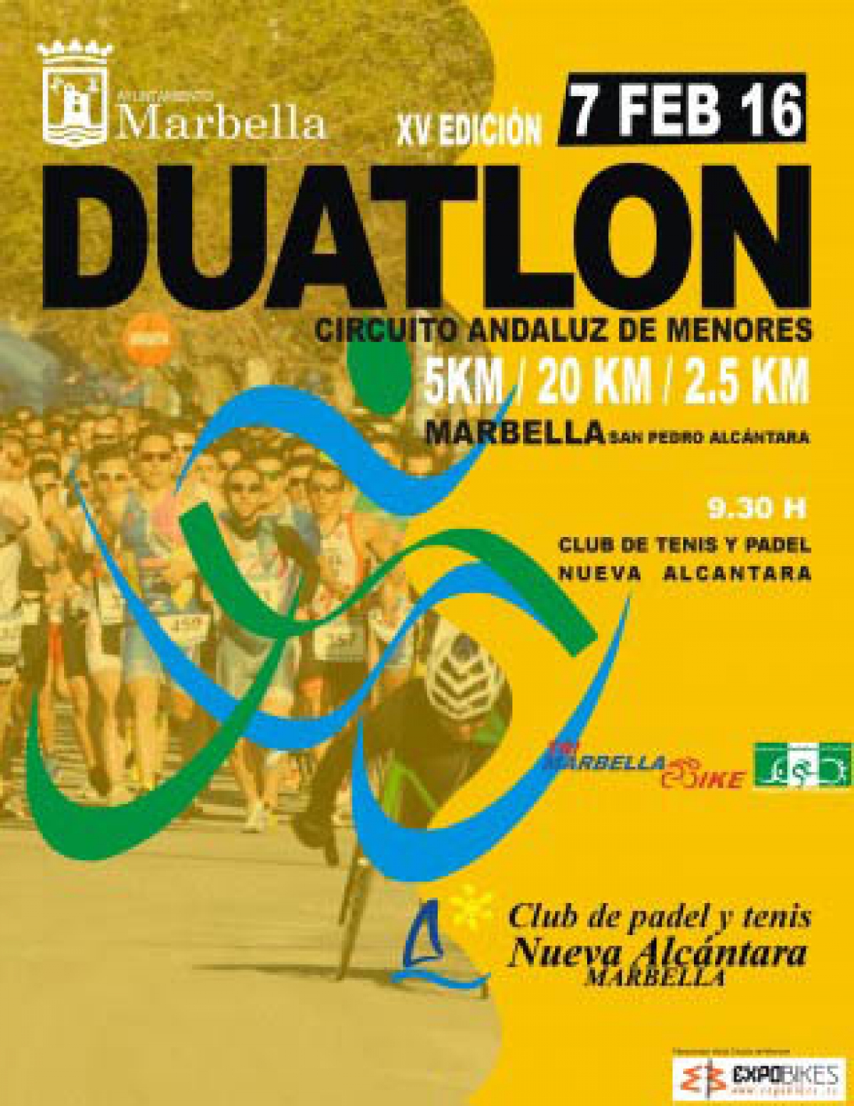 . CARRERA: XV.-DUATLON CIUDAD DE MARBELLA FECHA: DOMINGO 7 DE FEBRERO 2016 HORA: 9’30 HORAS LUGAR: MARBELLA ( Málaga) CORREDORES: 300 DISTANCIA: DISTINTAS 5 Km a pie + 20 Km …